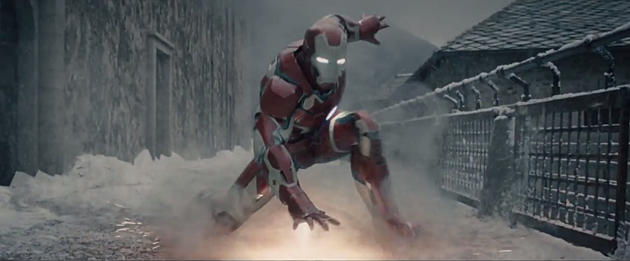 The first of these two images of Iron Man feature him striking the iconic landing pose as he gets ready to storm Baron Von Strucker's castle. The second is Iron Man getting hit by a huge blast of some sort. It could be during a battle with Scarlet Witch or with Ultron. Based on an image you can see later on, it appears to be an Ultron blast.